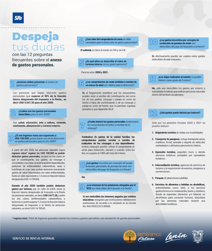 Las personas naturales cuyos gastos personales deducibles del 2020 hayan superado los USD 5.657,50, deben presentar el anexo de gastos personales en línea que estará disponible a partir del 06 de febrero del 2021, en el portal SRI en línea de www.sri.gob.ec.