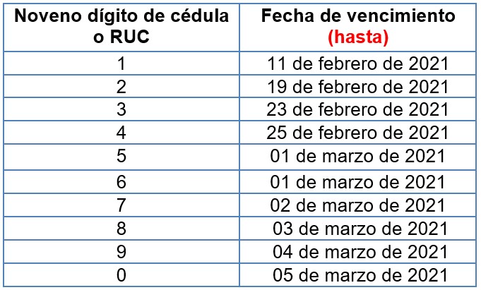 Para facilitar el cumplimiento de esta obligación y evitar retrasos en la presentación, el Servicio de Rentas Internas (SRI), mediante Resolución Nro. NAC-DGERCGC21-00000009, dispuso que el anexo correspondiente al período fiscal 2020 se lo presente de acuerdo al noveno dígito de cédula o RUC y hasta las siguientes fechas: